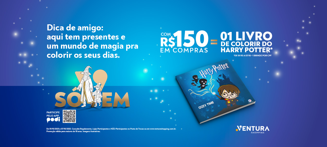 A partir de 01 de outubro de 2025, aproveite a promoção especial do Ventura Shopping: com R$150 em compras, você garante 1 Livro de Colorir do Harry Potter (01 por CPF) 🪄✨. O brinde é perfeito para os fãs da saga mais mágica do mundo.